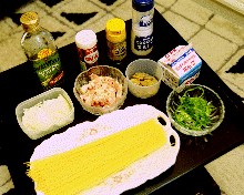 1.まず、スパデッティをお好みの固さにゆで、ゆであがったらカゴに移してオリ−ブオイルをかけておきます。2.熱したフライパンに油を引き、ベ−コン、玉ねぎ、ピ−マン、マッシュル−ムを炒め塩、コショ−で味付けします。