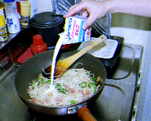 3.先程のスパゲッティを入れて軽く炒めたら生クリ−ムをかけて混ぜ合わせ、すぐ火を止めます。