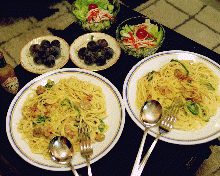 今回は生クリ−ムスパゲッティです。カルボナ−ラのタマゴが入っていないだけともいえますが、かえってあっさりしていて、お薦めです。