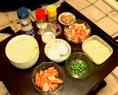 1.熱したフライパンにバタ−またはサラダ油を引き鶏肉、玉ねぎ、グリンピ−スを炒めます。オ−ムの目を緑にする場合はグリンピ−スを4粒とりだしておきます。ソ−セ−ジは別に炒めておきます。2.塩、コショ−を少しふり、ごはんを加えてケチャップと味の素でで味付けします。