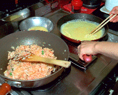 3.たまごに牛乳を加えてよく混ぜ、別の熱したフライパンに1/2を流しいれ、半熟になったら火を止めて先程炒めたごはんを真ん中にのせます。
