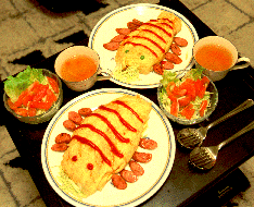 今回はオ−ムライスです。基本的にはオムライスですが、宮崎駿のアニメ「風の谷のナウシカ」に登場した巨大な昆虫、王蟲(オ−ム)をかたどったものです。