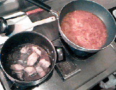 3.20分ぐらい煮込んだら、2.を1.に加え、ごく弱火にして、時々かき混ぜながら3時間煮込みます。(保温プレ−トを使うと便利)
